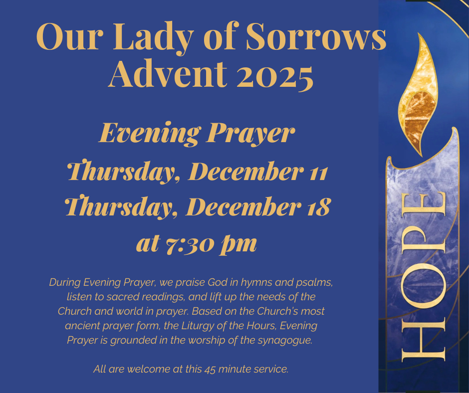 Stay connected to Our Lady of Sorrows Parish throughout the week for the latest news and announcements. Sign up for our weekly email newsletter and each week you'll receive news and information, including some that just doesn't fit in the bulletin.
